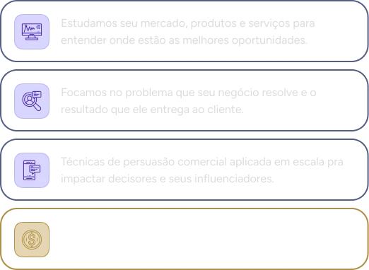 Identificamos e engajamos potenciais clientes, entregando leads quentes ao seu time.